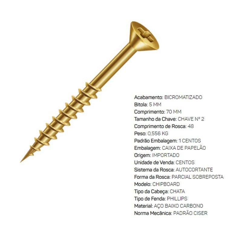 Parafuso Chipboard 5,0x70mm P/ Madeira Mdf Unidade